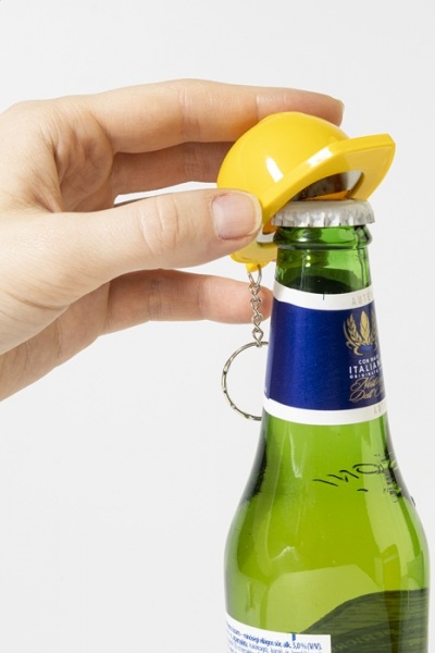 Prívesok na kľúče v tvare bezpečnostnej prilby z recyklovaného ABS materiálu s otváračom na fľaše.