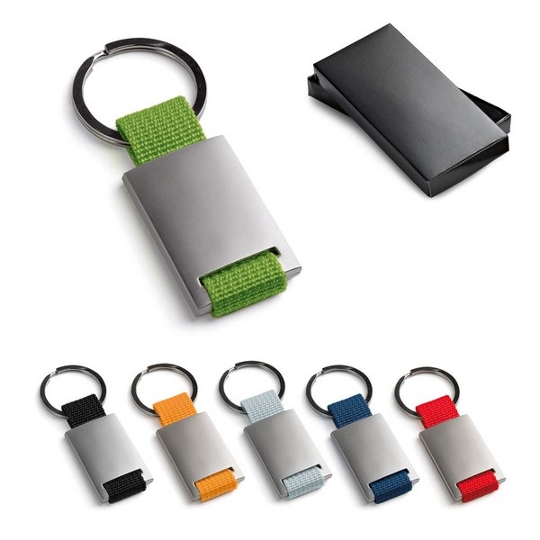 Kľúčenka z kovu a popruhoviny, dodáva sa v darčekovej krabičke.