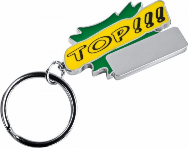 Kovová kľúčenka s farebným lakovaním vpredu.