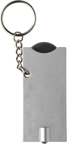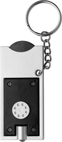 Plastová kľúčenka s bielou LED diódou a plastovým žetónom do nákupného košíka (rozmer žetónu vo veľkosti mince 0,50 €, nehodí sa do nákupných košíkov vo Veľkej Británii). Batérie v cene.
