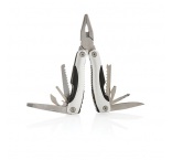 Hliníkový multifunkčný nôž, rukoväť s čiernymi detailmi, 14 funkcií, uložený v čiernom puzdre 600D.