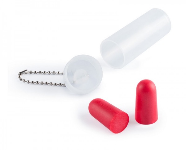 Farebné špunty do uší z EVA materiálu v transparentnej plastovej krabičke s kovovým retiazkou.