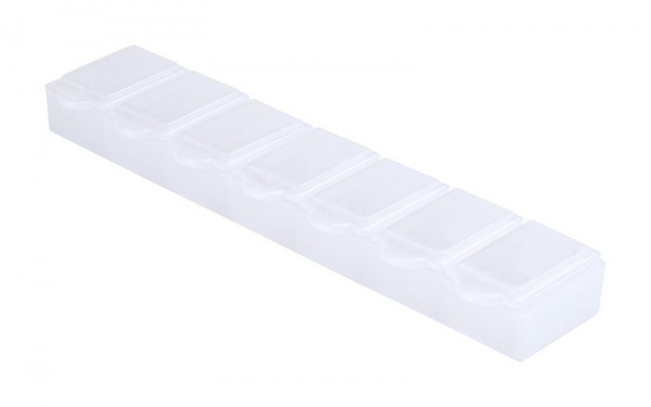Plastový, týždenné box na pilulky, so 7 priehradkami.