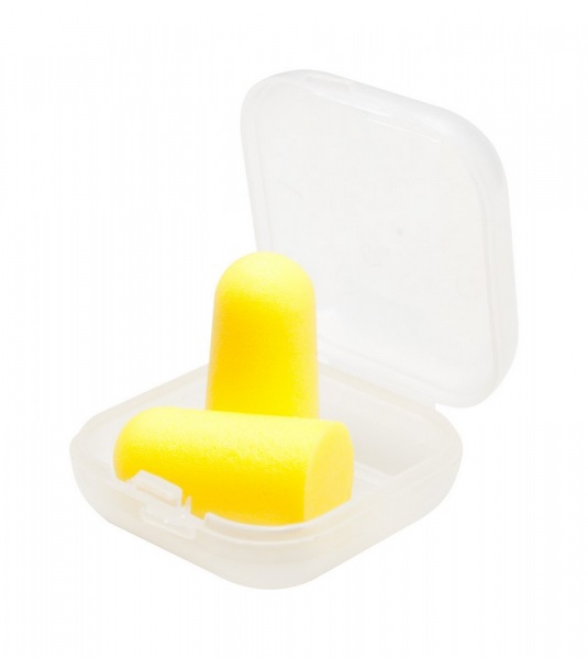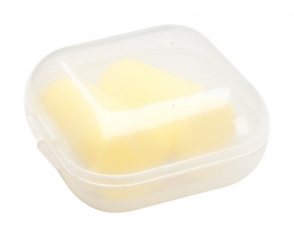 Farebné špunty do uší v priehľadnom, plastovom puzdre, vyrobené z EVA materiálu.