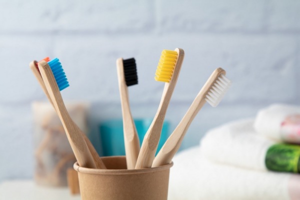 Kefka na zuby pre dospelých z bambusu a farebnými nylonovými štetinami a farebným koncom držadla. V Kraftovej papierovej škatuľke.