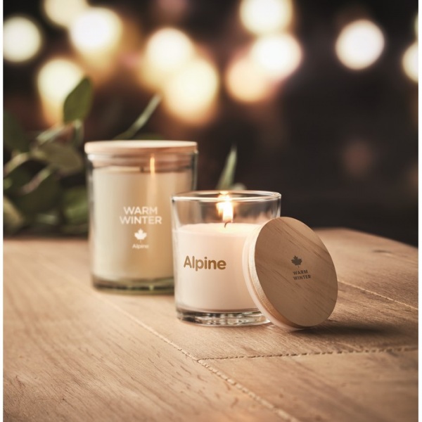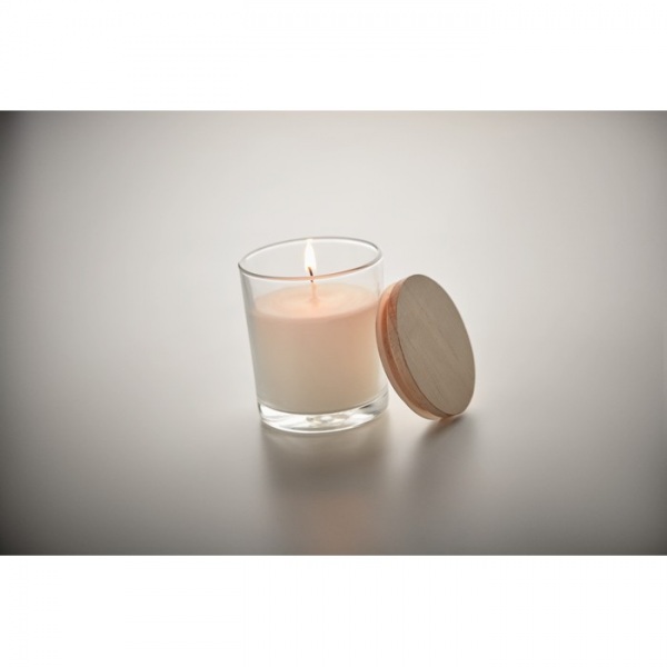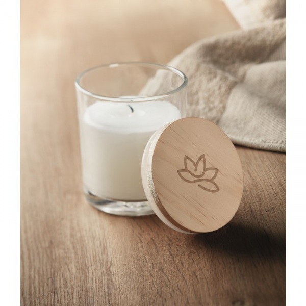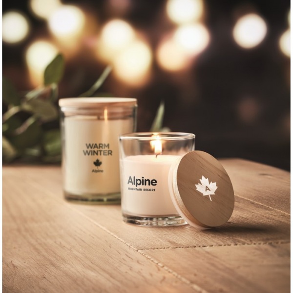 Vosková sviečka s vôňou vanilky 120 g v skle s bambusovým vrchnákom v darčekovej papierovej tube. 7 cm priemer. Doba horenia: 20 hodín. Bambus je prírodný produkt, môžu existovať mierne odchýlky vo farbe, čo môže ovplyvniť konečný výsledok potlače.
