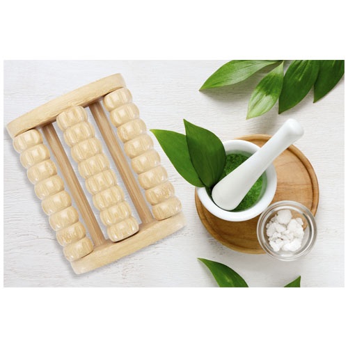 Masážny valček na nohy vyrobený z bambusu s 3 radmi masážnych tyčí. Jednoducho položte masážny prístroj na podlahu a potom pohybujte nohami na navodenie príjemného relaxačného pocitu. Použitý bambus sa získava a vyrába v súlade so zásadami udržateľnosti.