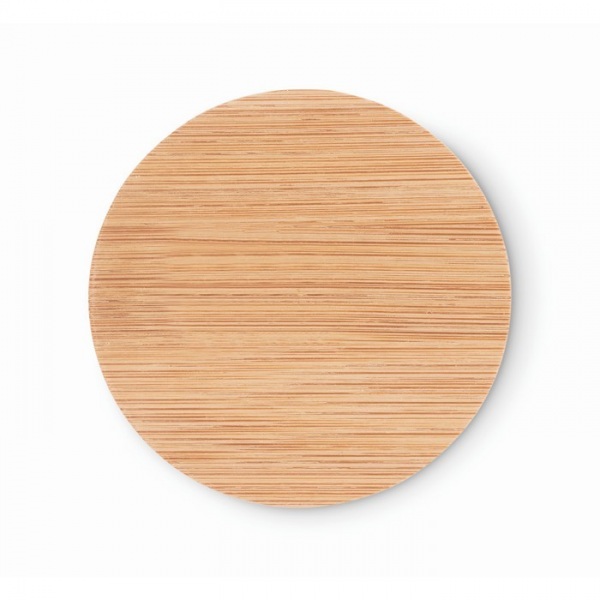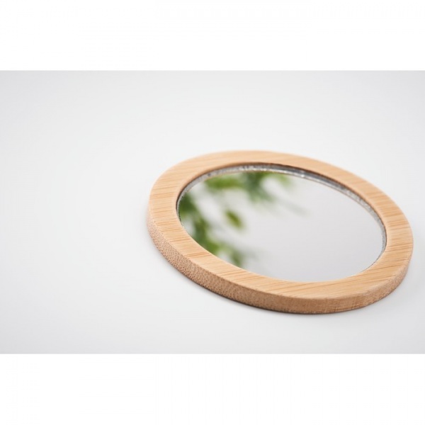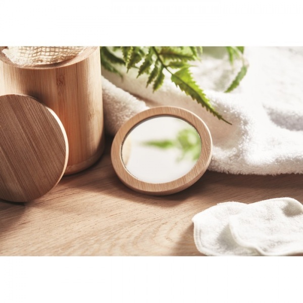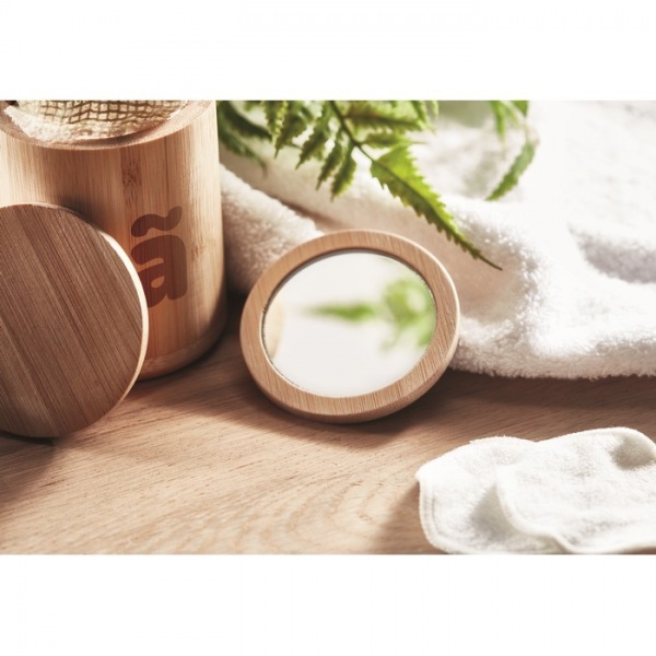 Okrúhle bambusové jednostranné kozmetické zrkadlo. Dodávané v bavlnenom puzdre so sťahovacou šnúrkou.