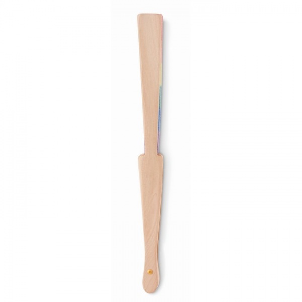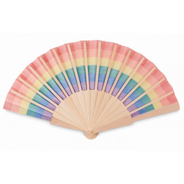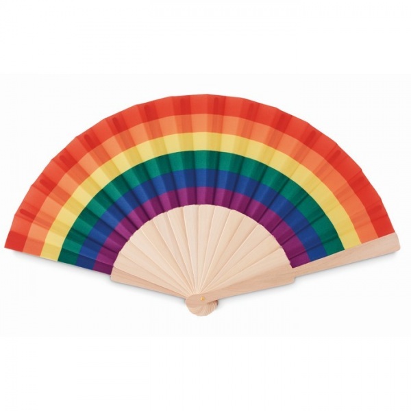 Ručný vejár z dreva a polyesterovej tkaniny s dúhovým vzorom.