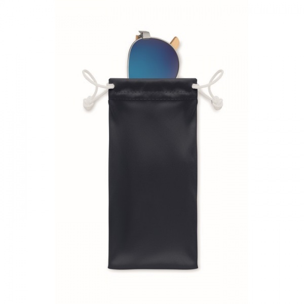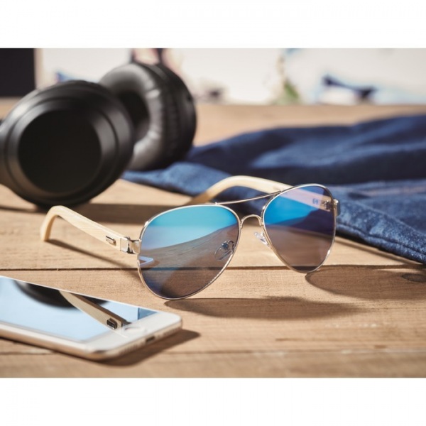 Slnečné okuliare s bambusovými nožičkami a farebnými zrkadlovými sklami v puzdre z mikrovlákna. Ochrana UV400.