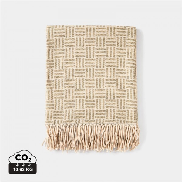 Žakárový tkaný prehoz na posteľ s jemným geometrickým vzorom. Je vyrobený zo 100 % akrylu, umelého syntetického materiálu, ktorý svojimi vlastnosťami imituje vlnené vlákno. Norma OEKO-TEX 100