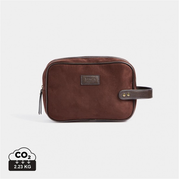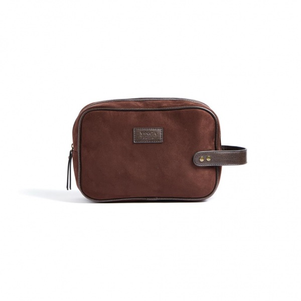 Klasická a moderná toaletná taštička z imitácie semišu s detailmi z PU kože. Umožňuje štýlové uloženie toaletných potrieb doma aj na cestách. Má praktickú veľkosť a vďaka popruhu s mosadznými detailmi na krátkej strane sa ľahko nosí.