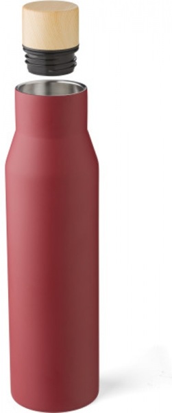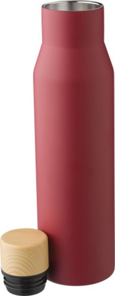 Fľaša z nehrdzavejúcej ocele (s/s304) (500 ml) s dvojitou stenou a dreveným viečkom. Jednotlivo balené v hnedej kartónovej krabici.