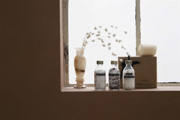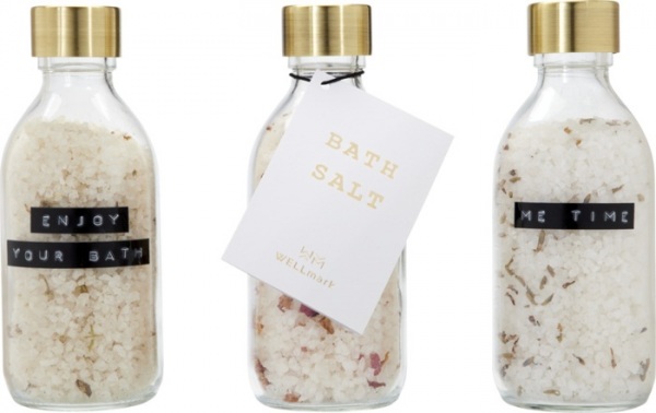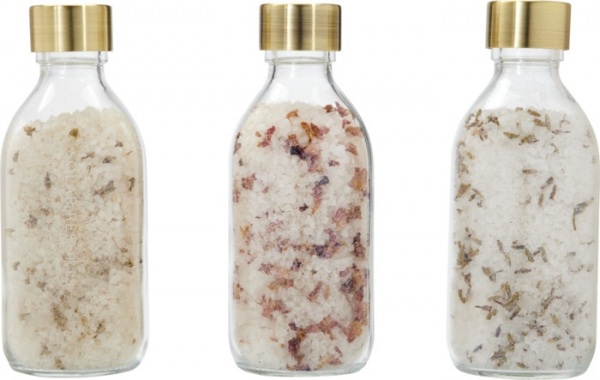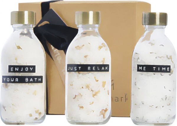 Darčeková sada "Just Relax" s 3x 200 ml kúpeľovej soli z Mŕtveho mora vo fľaštičke z číreho skla s oceľovým uzáverom v mosadznej farbe. Každá fľaštička má inú vôňu: Ruže, Levanduľa a Harmanček. Vyrobené v Holandsku.