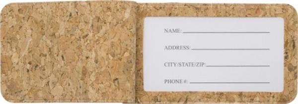 Korková visačka na batožinu s gumičkou, skrytá kartička pre vyplnenie osobných údajov.