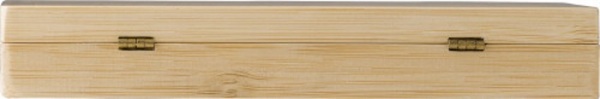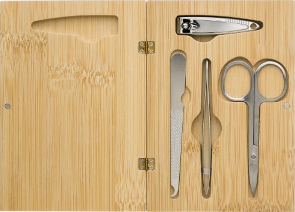 Bambusová manikúra (nožnice na nechty, nožnice, pinzeta a pilník). Jednotlivo balené v hnedej kartónovej krabičke.
