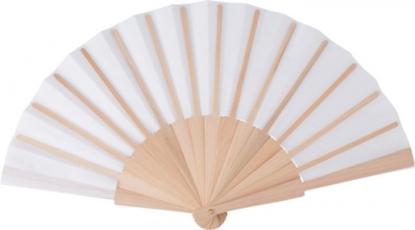 Ručný ventilátor rPET s drevenou rukoväťou. Jednotlivo balené v hnedej kartónovej krabici.