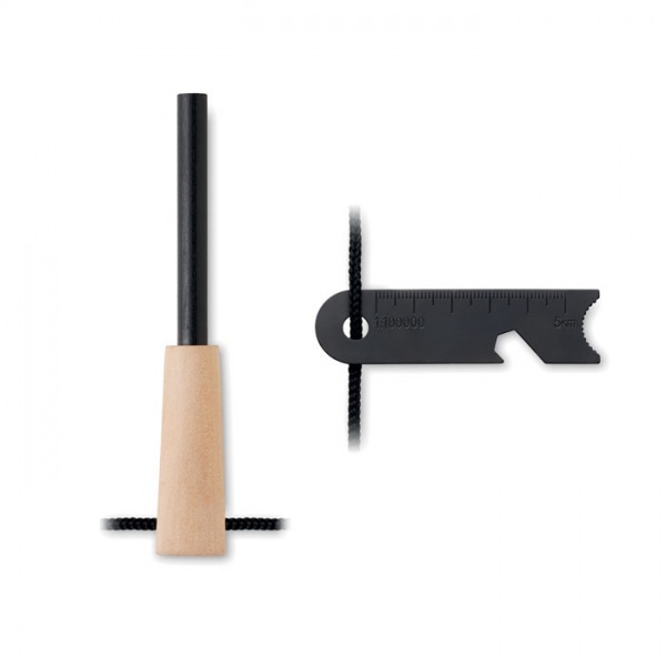 Náradie na zapálenie ohňa z borovicového dreva a nehrdzavejúcej ocele vrátane zapaľovacej tyče, viacúčelovej škrabky na použitie s vaším zapaľovačom, otvárača na fľaše, presného pravítka a šesťhranného kľúča.