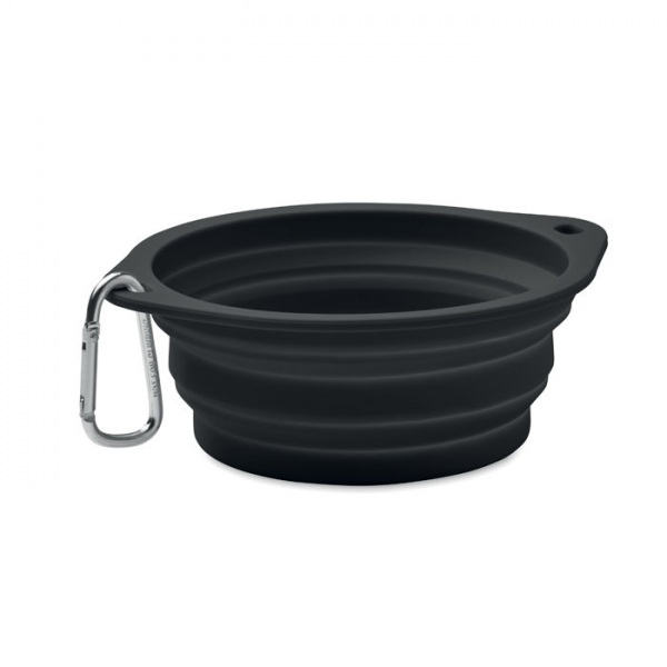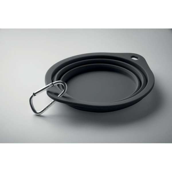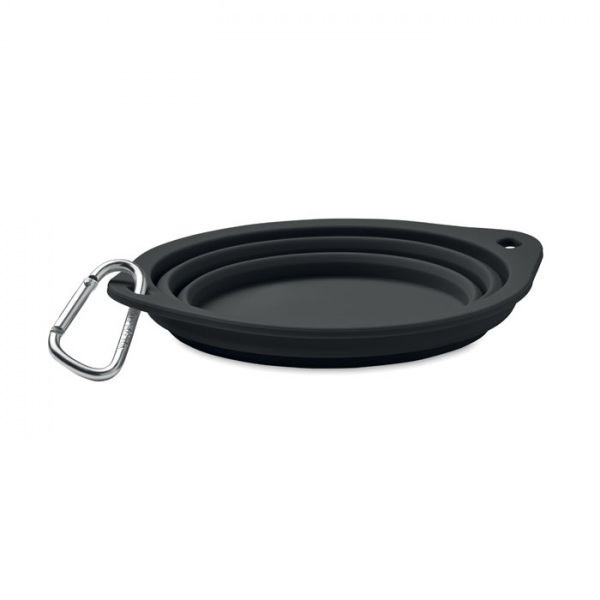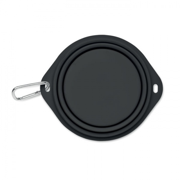 Skladacia prenosná silikónová miska pre domáce zvieratá na pitie alebo jedlo s karabínou. Kapacita: 350ml.