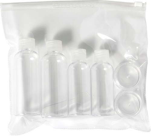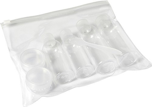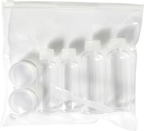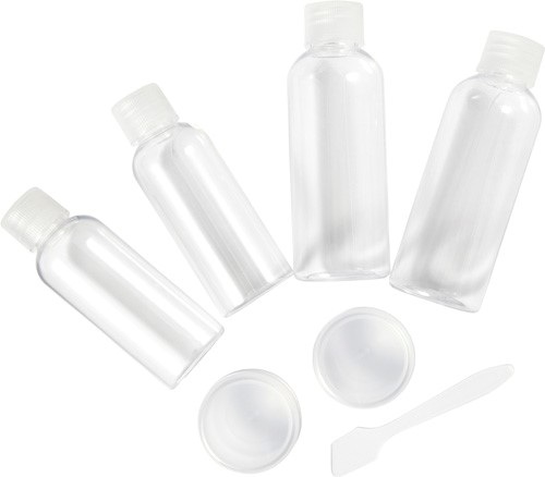 Cestovná súprava PETG, ktorá obsahuje dve 100ml fľaše, dve 50ml fľaše, dve 10ml nádoby a malú špachtlu.