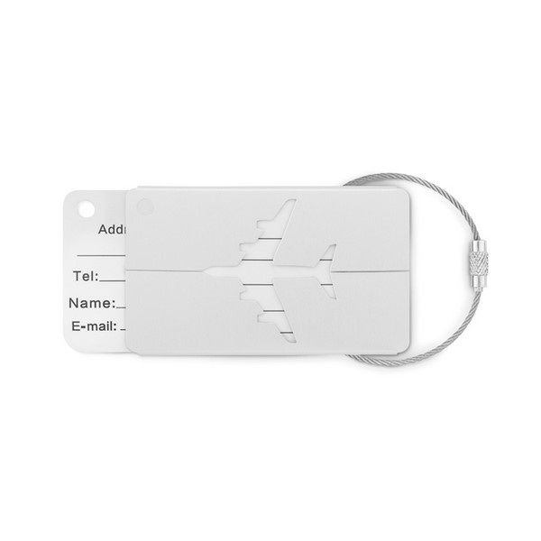 Hliníková visačka na batožinu so štítkom pre adresu a s páskou pre pripevnenie k batožine.