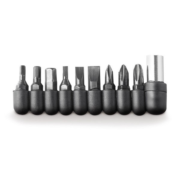 19-dielna multifunkčná sada z nerezovej ocele a dreva dodávaná v polyesterovom obale.