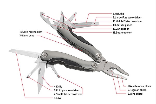 Luxusné značkové kombinované náradie Schwarzwolf, 15 nástrojov, ktoré obsahujú poistku, v čiernom neoprénovom puzdre. Balené v darčekovej krabičke Schwarzwolf. Materiál: nerezová oceľ, hliníková rukoväť s protišmykovým povrchom.