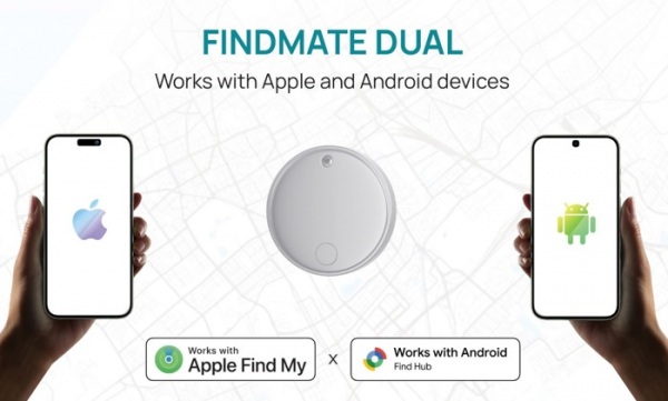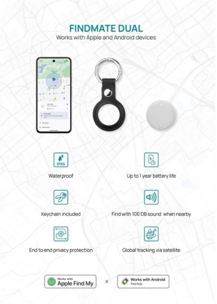 Lokátor kompatibilný s Apple Find My a Android Find My. Hlasný 100 dB alarm a reproduktor, Findmate Dual uľahčuje nájdenie predmetov v blízkosti. IPX5 vodeodolnosť a PU kľúčenka. Batéria vydrží až rok (vymeniteľná CR2032). Balenie FSC.