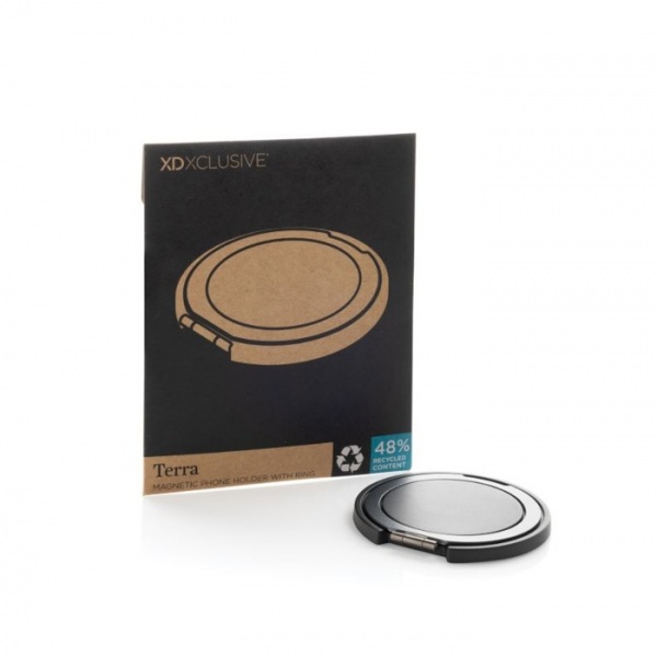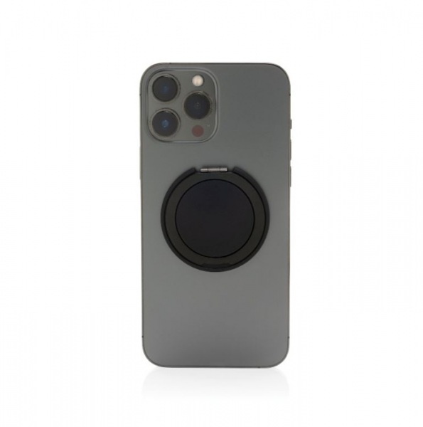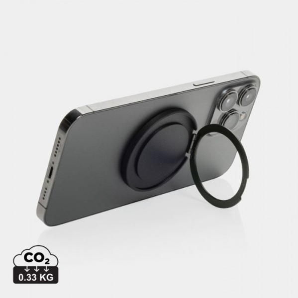 Magnetický držiak telefónu s extra silným magnetom. Kompatibilné so všetkými telefónmi, ktoré sú vybavené integrovaným magnetom. Hliníkový krúžok je možné odklopiť, aby sa z telefónu stal stojan. Podiel recyklátu: 48 %. RCS certifikácia.