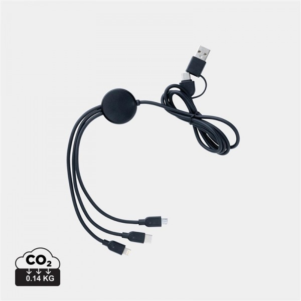 Nabíjací kábel 6 v 1. Puzdro z rec ABS plastu s RCS certifikáciou, kábel z rec TPE. Podiel recyklovaného materiálu: 57%. 5 konektorov: USB C/USB A vstup, USB C/micro USB/iOS výstup. Bez PVC. Balené v FSC krabičke.