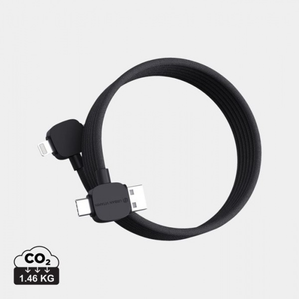 120 cm magnetický nabíjací a dátový kábel. Magnetické prevedenie zabraňuje zamotávaniu. USB C a USB A vstupy. Výstupy pre iOS aj USB C zaisťujú kompatibilitu. 65W pre nabíjanie notebookov. Vhodný aj na prenos dát. Podiel recyklátu: 55%. PVC free.