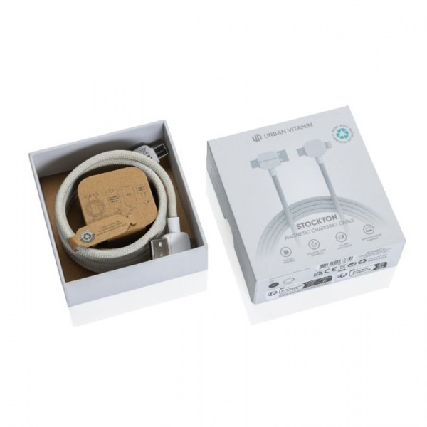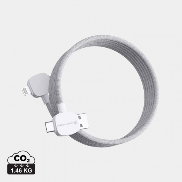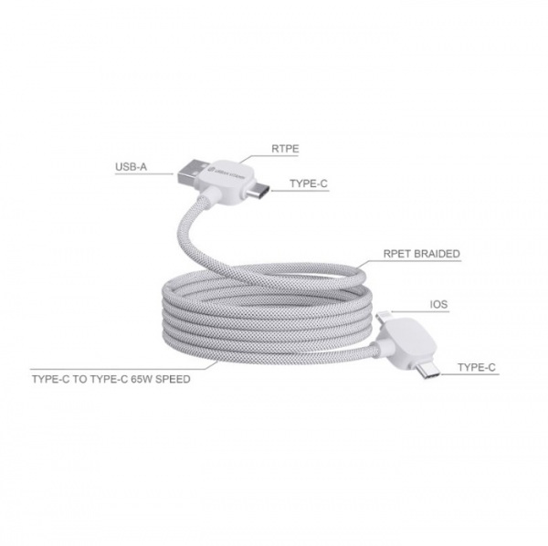 120 cm magnetický nabíjací a dátový kábel. Magnetické prevedenie zabraňuje zamotávaniu. USB C a USB A vstupy. Výstupy pre iOS aj USB C zaisťujú kompatibilitu. 65W pre nabíjanie notebookov. Vhodný aj na prenos dát. Podiel recyklátu: 55%. PVC free.
