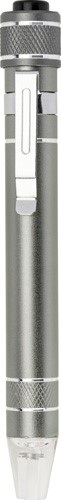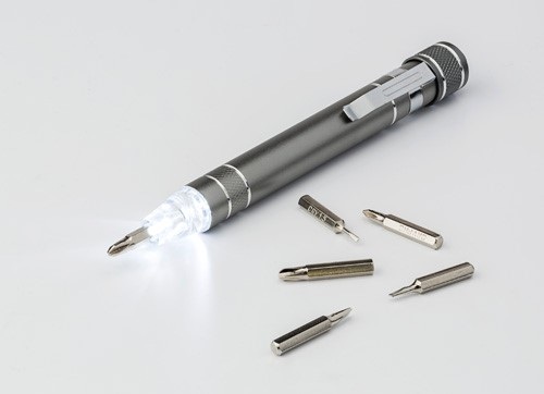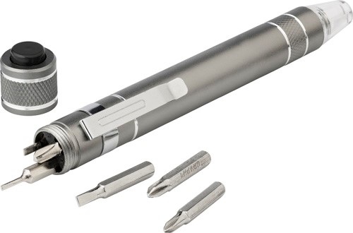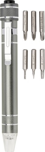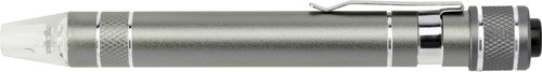 Hliníkový vreckový skrutkovač v tvare pera so sadou násad a svetlom. Skrutkovač sa dodáva s 3 plochými násadami a 3 násadami Philips. Batérie v cene.