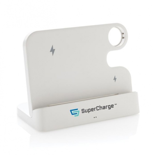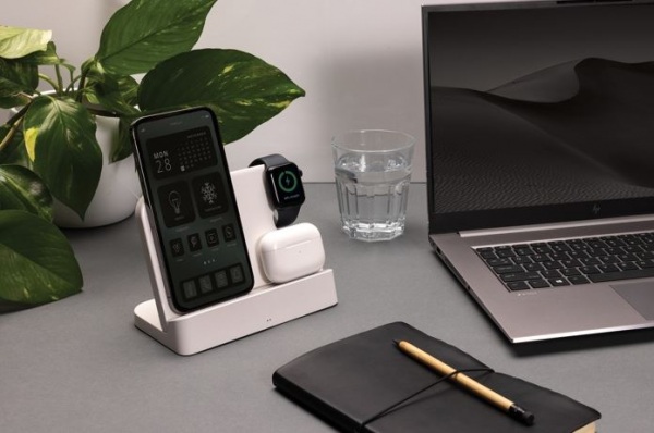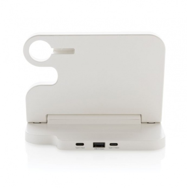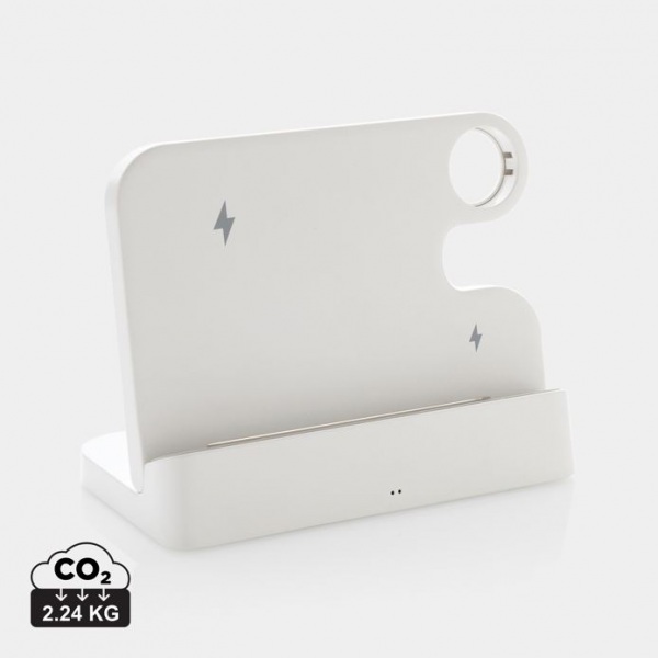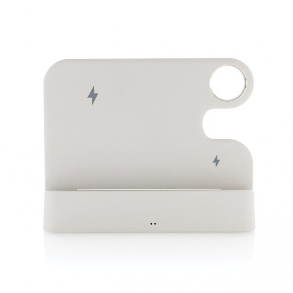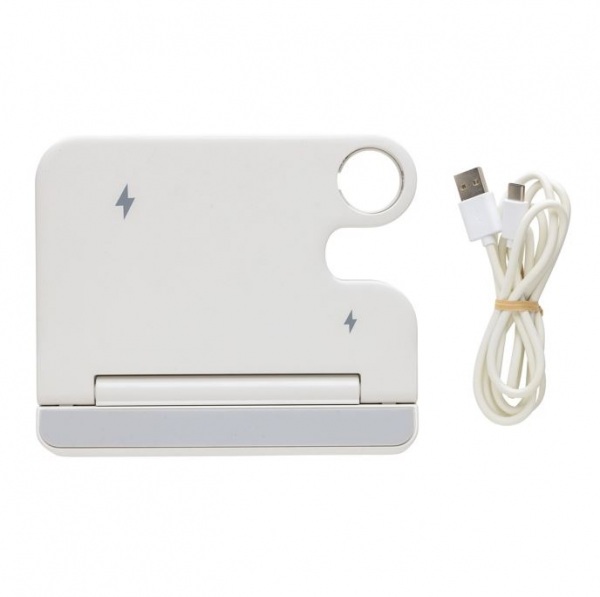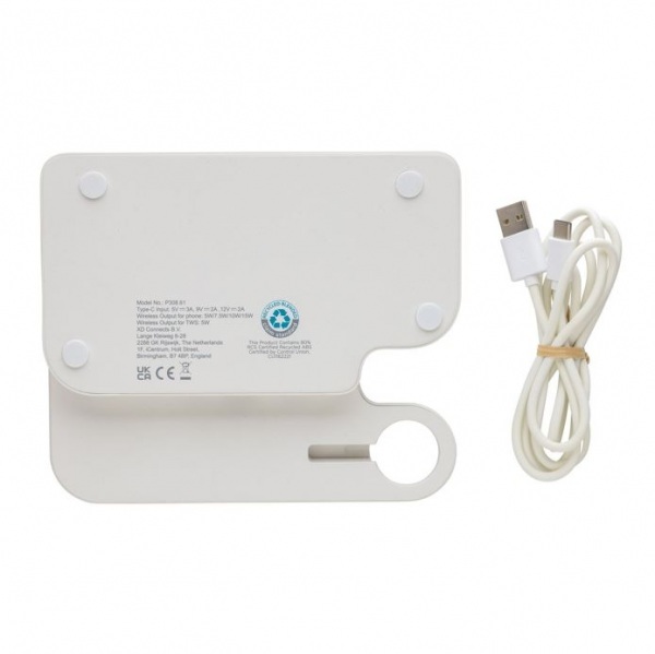 Nabíjací stojan s 15W bezdrôtovou nabíjačkou. 5W bezdrôtová nabíjačka slúži na nabíjanie menších zariadení. Na zadnej strane výstup 5V/1A USB A a USB C na nabíjanie pomocou kábla. Podiel recyklátu: 80%. 120 cm kábel USB A až USB C. FSC® krabička. Bez PVC.