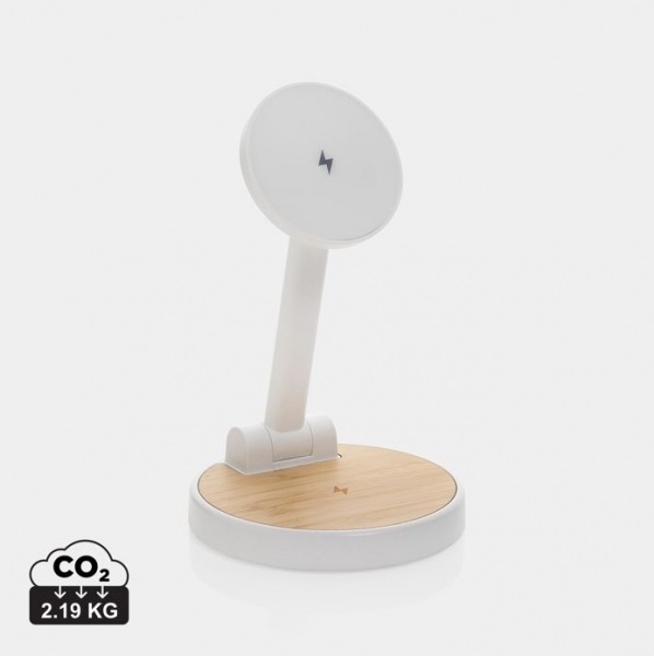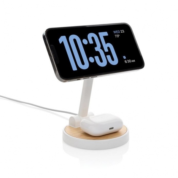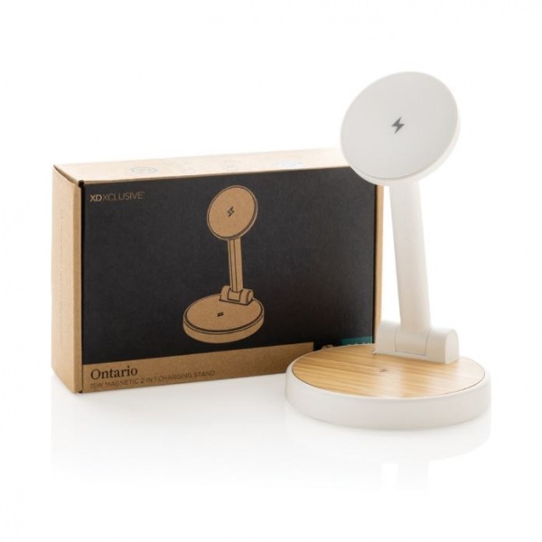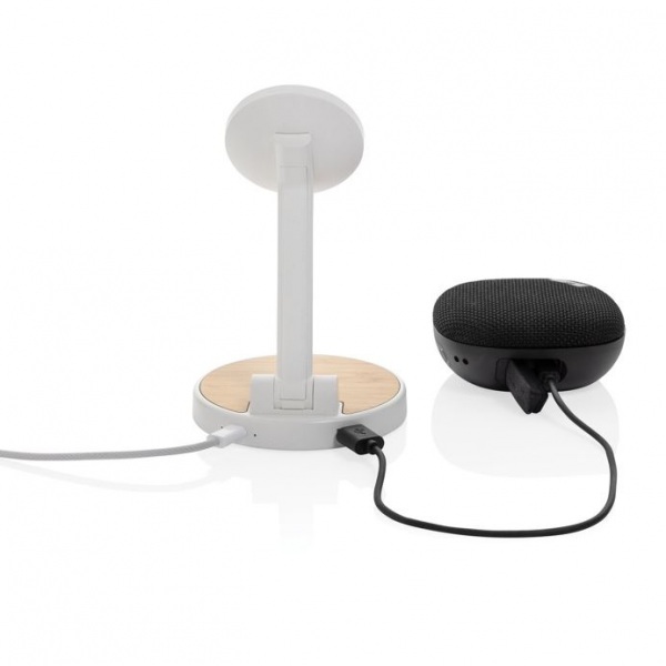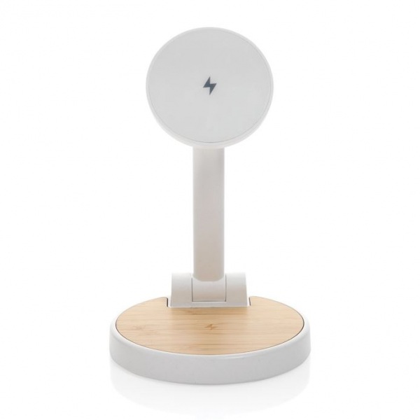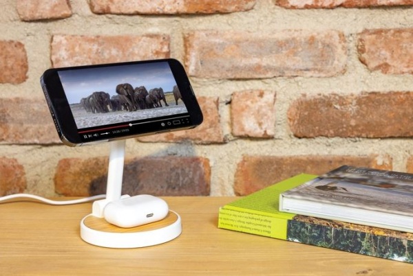 Magnetická 15W časť pre telefóny, 5W časť pre menšie zariadenia. Jeden dodatočný USB A výstup pre nabíjanie cez kábel. Podiel recyklátu: 75%. RCS certifikácia. Bambusová časť zo 100% FSC bambusu. 120cm USB C kábel. FSC® kraftová krabička. Bez PVC.