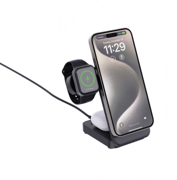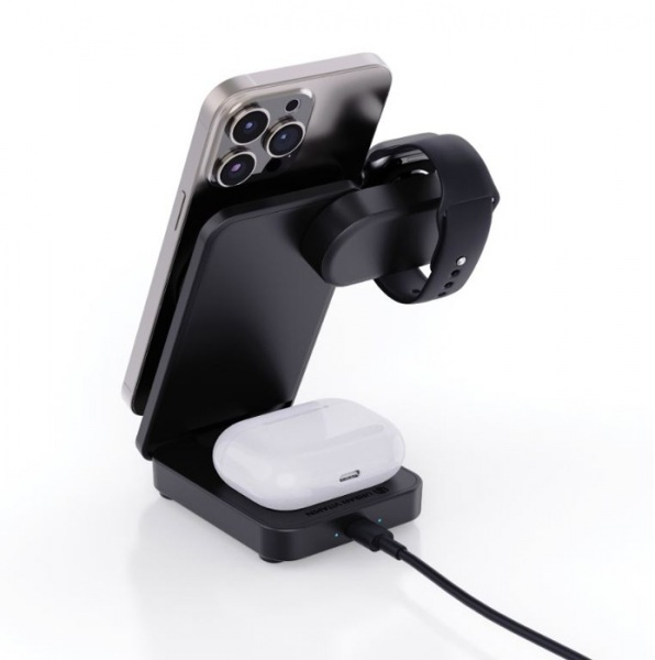 15W magnetická nabíjačka na telefón, 5W nabíjacia podložka pre druhý telefón alebo slúchadlá, nabíjačka pre najnovšie generácie iWatch. 120cm recyklovaný TPE kábel. Pre fungovanie vyžaduje rýchlonabíjací zdroj napájania (minimálne 9V/2A). PVC free.