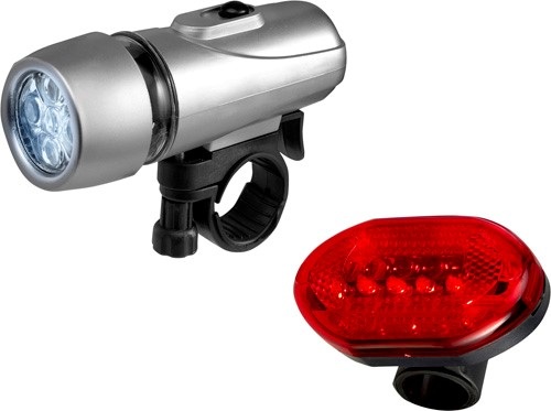 Sada 2 svietidiel na bicykel, materiál: plast ABS; predné svetlo má 5 LED diód a 3 funkcie, zadné červené svetlo má 4 LED diódy a 7 funkcií. Batérie v cene.
