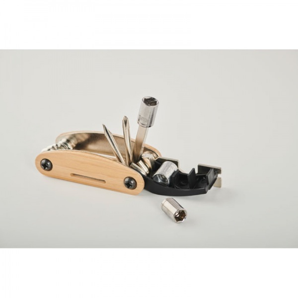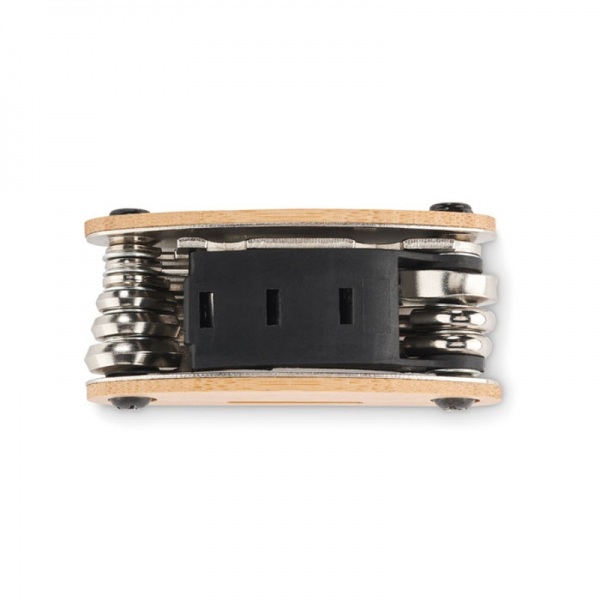 Multifunkčné náradie z nerezovej ocele s bambusovým krytom. 11 funkcií ako je imbus, plochý a krížový skrutkovač, nástrčný kľúč a ďalšie.