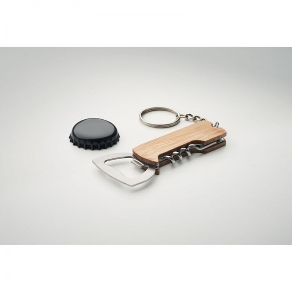 Vreckové náradie 3v1 s bambusovým krytom a krúžkom na kľúče. Otvárač na fľaše, vývrtka a nôž.
