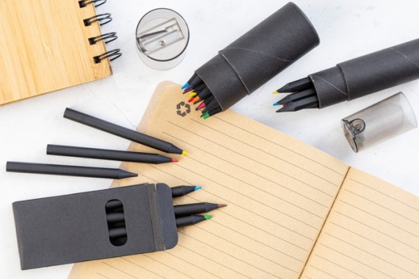 12dielna sada pasteliek z čierneho dreva v okrúhlom čiernom puzdre z kartónu s plastovým strúhadlom.