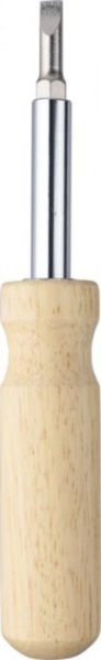 Sada skrutkovačov z kaučukovníka so 4 magnetickými bitmi (dva na každom obojstrannom kolíku) uloženými vo vnútri rukoväte. Praktický a kompaktný dizajn s vymeniteľnými bitmi a držiakom. Jednotlivo balené v hnedej kartónovej krabici.