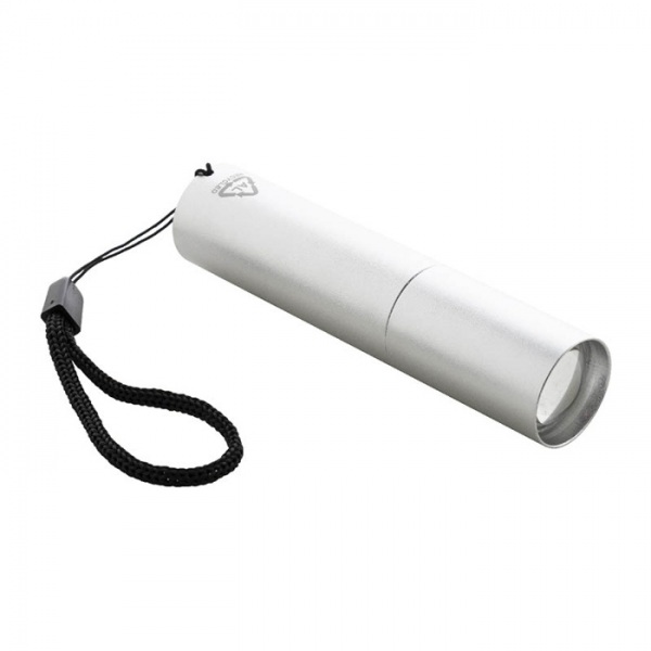 Baterka z recyklovaného hliníka so vstavanou dobíjacou batériou USB (400 mAh) a popruhom na nosenie. S vysoko výkonným COB svetlom s možnosťou zoomu a 3 svetelnými režimami. Vrátane nabíjacieho kábla USB.