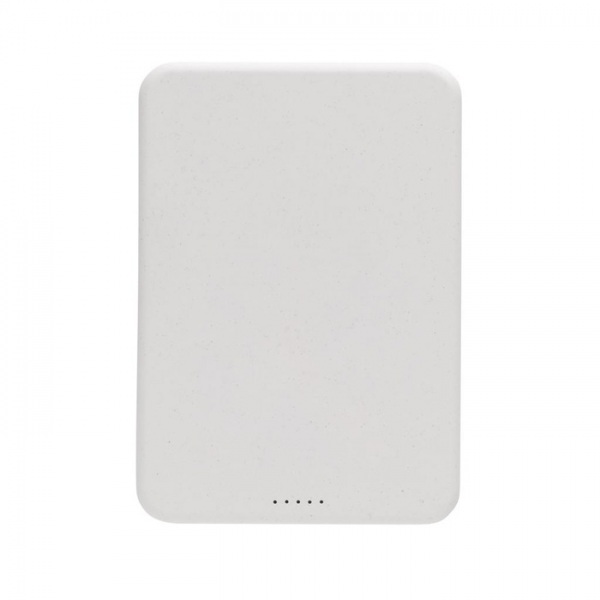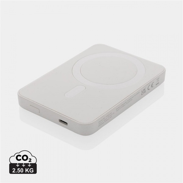 Vrecková powerbanka 5 000 mAh s magnetickým bezdrôtovým nabíjaním 5W. Podiel recyklátu: 20%. Svetelné indikátory stupňa nabitia. USB vstup C: 5V/2,4A. USB C výstup: 5V/2,4A, bezdrôtový výstup: 5W. Vrátane kábla z rec. TPE. PVC free. FSC® krabička.