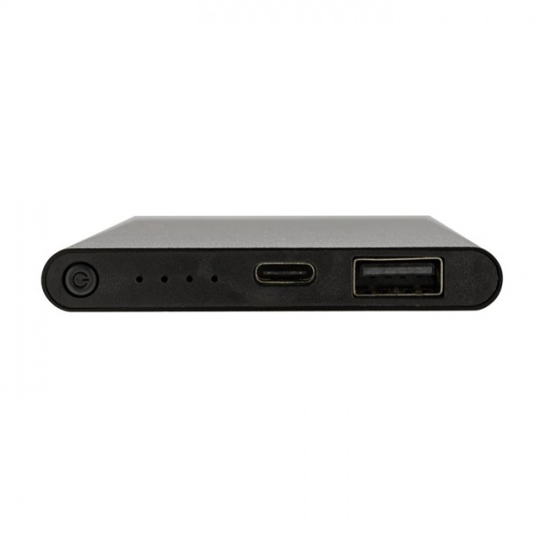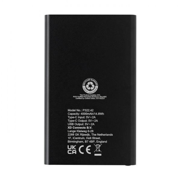 Plochá powerbanka 4 000 mAh. RCS je globálny štandard, ktorý umožňuje overiť použitie rec. materiálu. Podiel recyklátu: 36%. Svetelné indikátory. USB vstup C:5V/2A. USB C výstup:5V/2A, USB A výstup:5V/2A. Vrátane kábla z rec. TPE. PVC free. FSC® krabička.