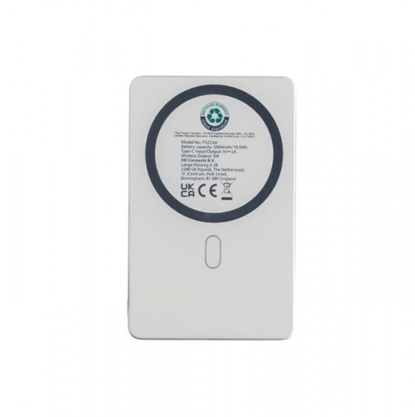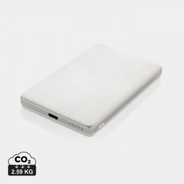 Ultratenká powerbanka s kapacitou 5 000 mAh a 5W magnetickou bezdrôtovou nabíjačkou. Powerbanka obsahuje lítium-polymérovú batériu triedy A s dlhou výdržou 5 000 mAh. Vstup typu C 5V/2,4A; výstup USB C: 5V/2A.4A. PVC free. Vrátane nabíjacieho kábla.