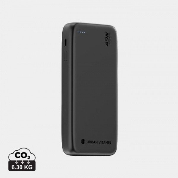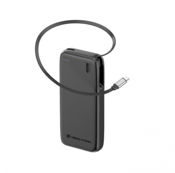 20000 mAh powerbanka s 70cm navíjacím USB-C káblom, plné nabitie powerbanky za pár hodín. 2 USB-C výstupy a 1 USB-A. Dve cez USB-C/USB A porty a 1 cez vstavaný kábel. USB-C podporujú rýchle PD nabíjanie do 45W. Podiel recyklátu: 19%. PVC free.