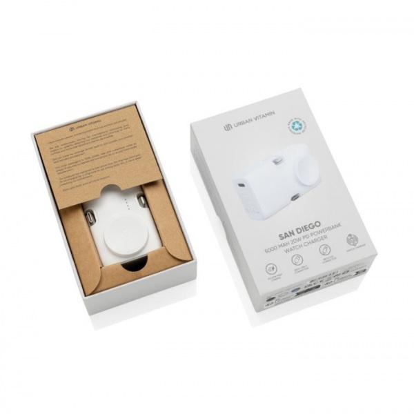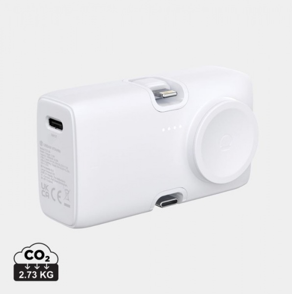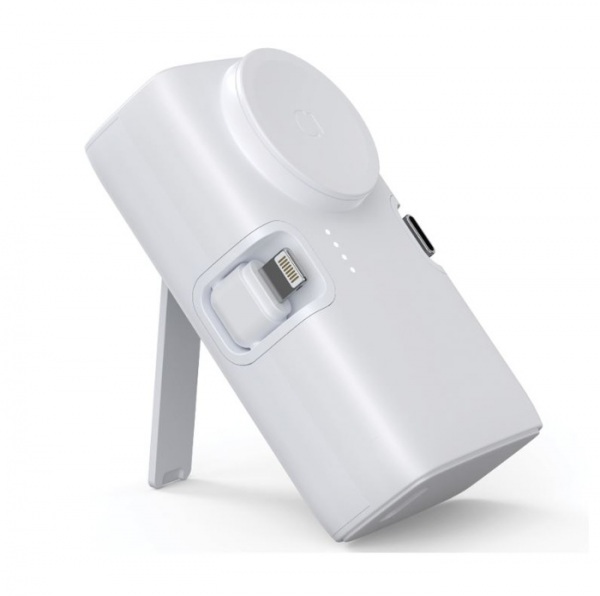 Powerbanka 5000 mAh s možnosťou duálneho rýchleho nabíjania cez integrovaný IOS konektor a najmodernejší výstup typu C. Ultra rýchle 20W nabíjanie. USB C vstupný port pre dobíjanie powerbanky. Integrovaná nabíjačka hodiniek Apple Watch a stojan na telefón.