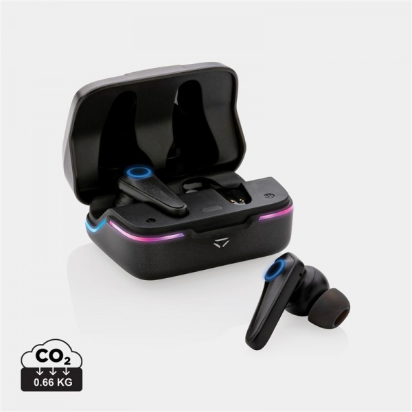 TWS slúchadlá s herným režimom s nízkou latenciou (60ms), RGB svetlá v rôznych režimoch, dotykové ovládanie. BT 5.1 s dosahom 10 m. Výdrž batérie 6 h. Doba nabíjania slúchadiel: 1h, krabičky: 2 h. Vodeodolnosť IPX4. Vrátane 3 veľkostí špuntov. Bez PVC.