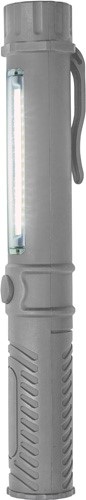 Plastové pracovné svietido s COB diódami na vrchu aj zboku v držiaku. Batérie v cene.
