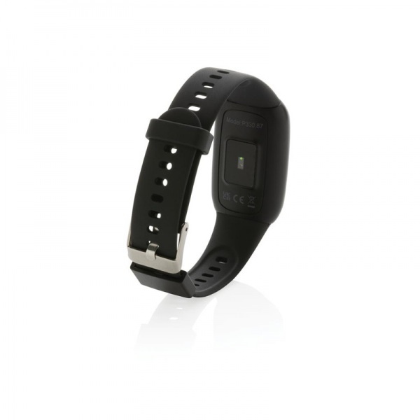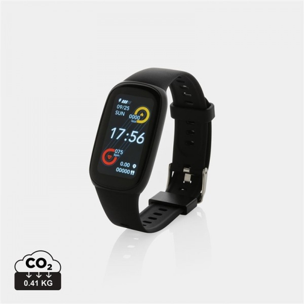 Vodeodolnosť IPX67, 1,47" dotykový OLED displej. Pásik z RCS recyklovaného TPE, hodinky z RCS rec. ABS plastu. Celkový podiel recyklátu: 35%. Telefonovanie, ovládanie hudby. Mobilná appka zdarma. Pohot. režim: 20 dní. Balené v FSC® krabičke. Bez PVC.